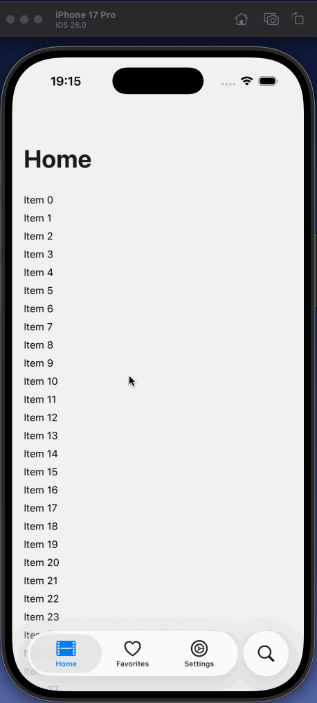 Result of this configuration so far is the expected result. On an iOS Simulator running 26 version, you will see the large header title enabled for the home screen and smoothly collapsing into a regular title: