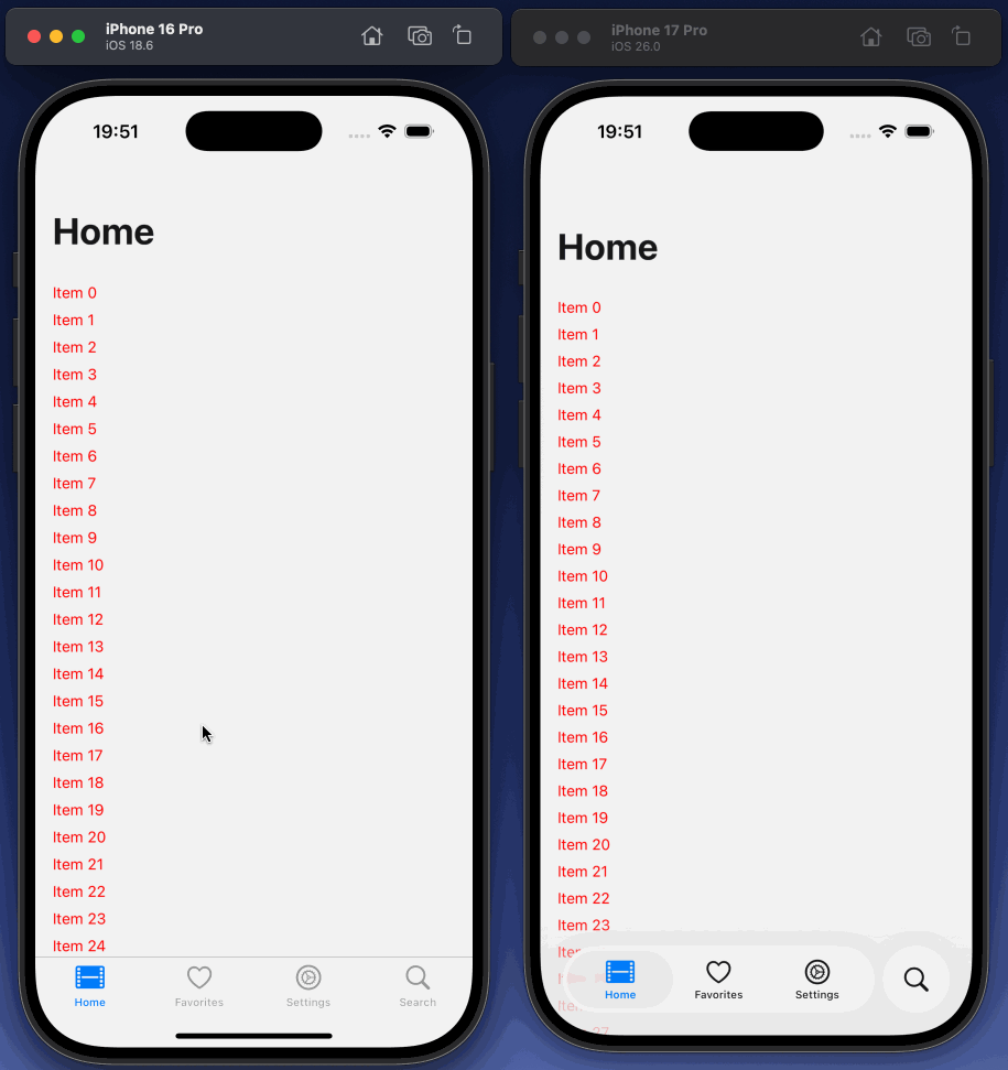 Here’s where things get interesting. If you test this on an iOS 18, you will notice that a blur effect is not applied behind the regular title. That is because pre-iOS 26 versions need an explicit blur configuration to work. You can achieve this by setting the headerBlurEffect prop to regular: