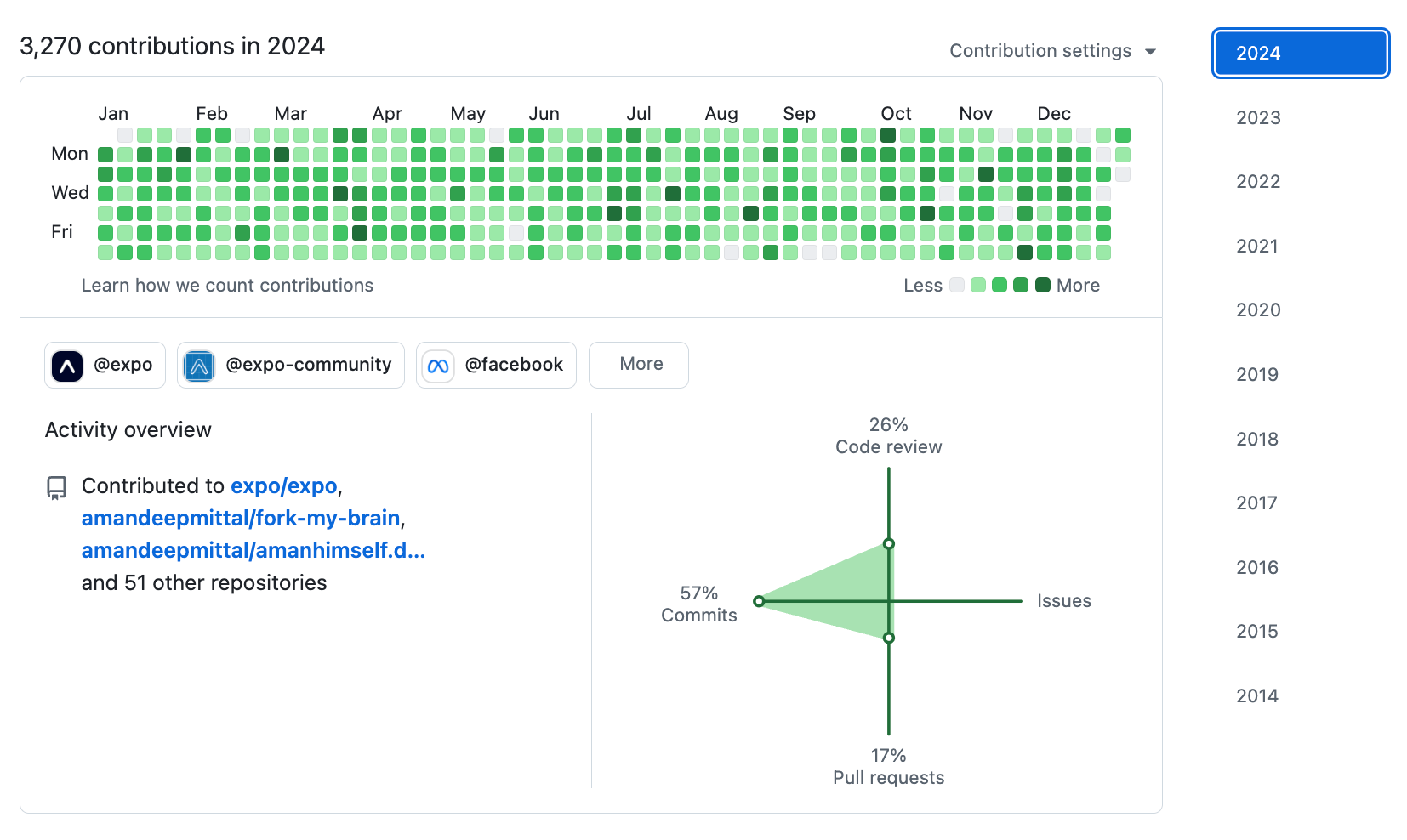 Personally, this statistic does not matter but the GitHub's commit graph is fun. It is also great to see that I have less green or empty blocks on weekends which is a good sign.